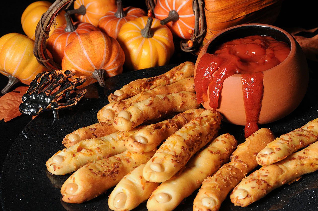 Lightly grease 2 large sheet pans; set aside. In a small bowl, mix together Bridgford Pepperoni or Bridgford Salami with cheese; set aside. Place thawed loaf of dough on a lightly floured surface (do not roll dough into a ball). Using a rolling pin, roll dough out into a 16″x 4″ rectangle. With a sharp knife or pizza cutter, slice the rectangle into 16, 4-inch long strips. Divide the meat/cheese mixture in half. Place one half on a flat surface, keep the remaining half in the small bowl. Take one strip of dough and press down to flatten. Place ½ tablespoon meat/cheese mixture from bowl down the center of strip. Press edges together and seal seams. Roll breadstick in the cheese/meat mixture that is on the flat surface. Repeat with remaining strips, making sure strips are 2-3 inches apart. Brush with melted butter. Let rise until puffy (30-60 minutes in a warm area). Place a macadamia nut onto the end of each stick to make a “fingernail.” Bake in a preheated 375° oven for 12-15 minutes or until light golden brown. Remove from oven and let cool slightly.