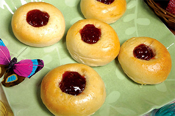 Let the dough thaw according to package directions. Set aside. To make filling, in a medium size bowl, mix together cream cheese with sugar, egg and vanilla with a mixer until well blended. Refrigerate. Place thawed dough on a lightly floured surface. If using loaves of dough, divide each loaf into 12 equal pieces. Roll each piece into a ball and place on a lightly greased sheet pan about 3” apart. Flatten each ball of dough to about ½“ high. Brush with melted butter. Let the dough rise for 30 min. With finger or back of spoon, make an indentation in the center of each roll (about ½”– 1” wide). Fill indentation with cream cheese filling and top with 1 teaspoon of strawberry preserves. Make sure that the filling is not above the top of the hole. Let the Kolaches rise until double in size. Bake in a preheated 375º oven. Remove after 5 minutes and brush dough with melted butter or margarine. Place back in the oven and continue baking 10-15 minutes more or until the dough is light brown in color. Remove from oven to cool on wire rack. Brush with remaining butter.
